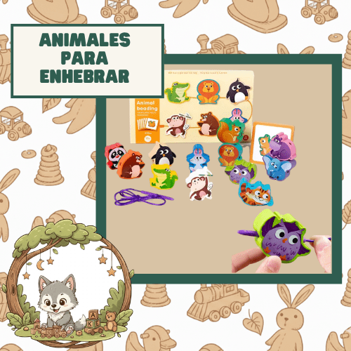 El juego incluye 12 bloques de madera con formas de animales (como león, panda, búho y cocodrilo etc.) tarjetas de desafíos de doble cara y una cuerda con punta rígida (tipo aguja de plástico) para facilitar el ensartado.